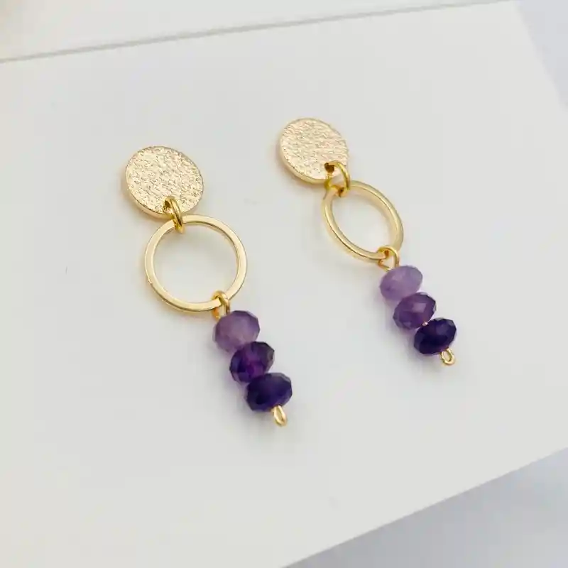 Aros Caroco dorados con piedras Amatista naturales organizadas en tonos degrados, un disco con textura y una argollita. Largo total de los aros: 3,2cm.