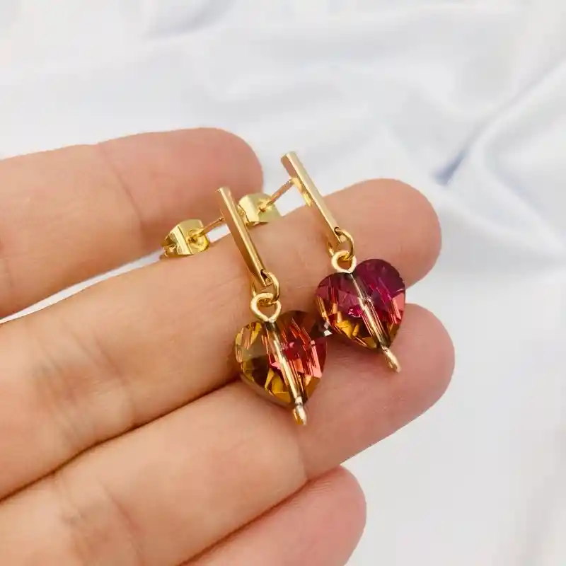 Aros con un palito dorado brillante con un cristal en forma de corazón con un color tornasol rojizo.