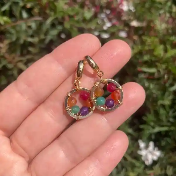 Aros dorados "Girasol multicolor" con un mix de piedras Agata multicolor, baño de oro de 18k., largo total 3cm.