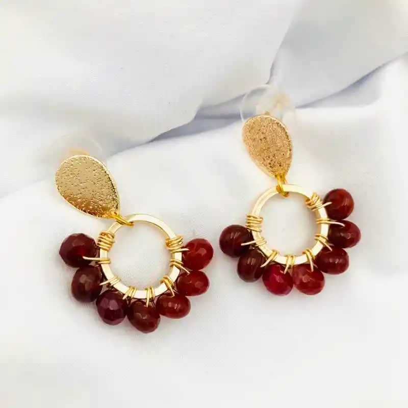 Aros dorados "Tulipán rojo" piedras Ágata tonos rojos, baño de oro de 18k. Largo total aros: 3,5cm.