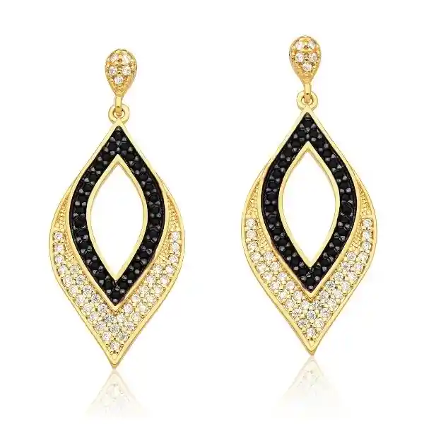 Aros con 3 baños de oro, un baño de 18, uno de 22 y uno de 24 kilates. Hecho con tecnología de láminas. Circones de alta calidad. Largo: 4,1 cm. Libre de níquel y plomo. Incluye elegante caja. Metal base: Bronce.