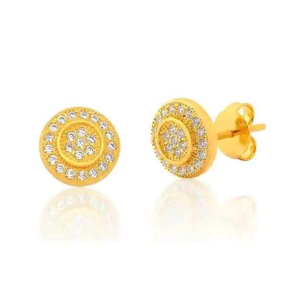 Aros con 3 baños de oro; un baño de 18; uno de 22 y uno de 24 kilates. Hecho con tecnología de láminas. Circones de alta calidad. Tamaño: 0,9 cm. Libre de níquel y plomo. Incluye elegante caja. Metal base: Bronce.