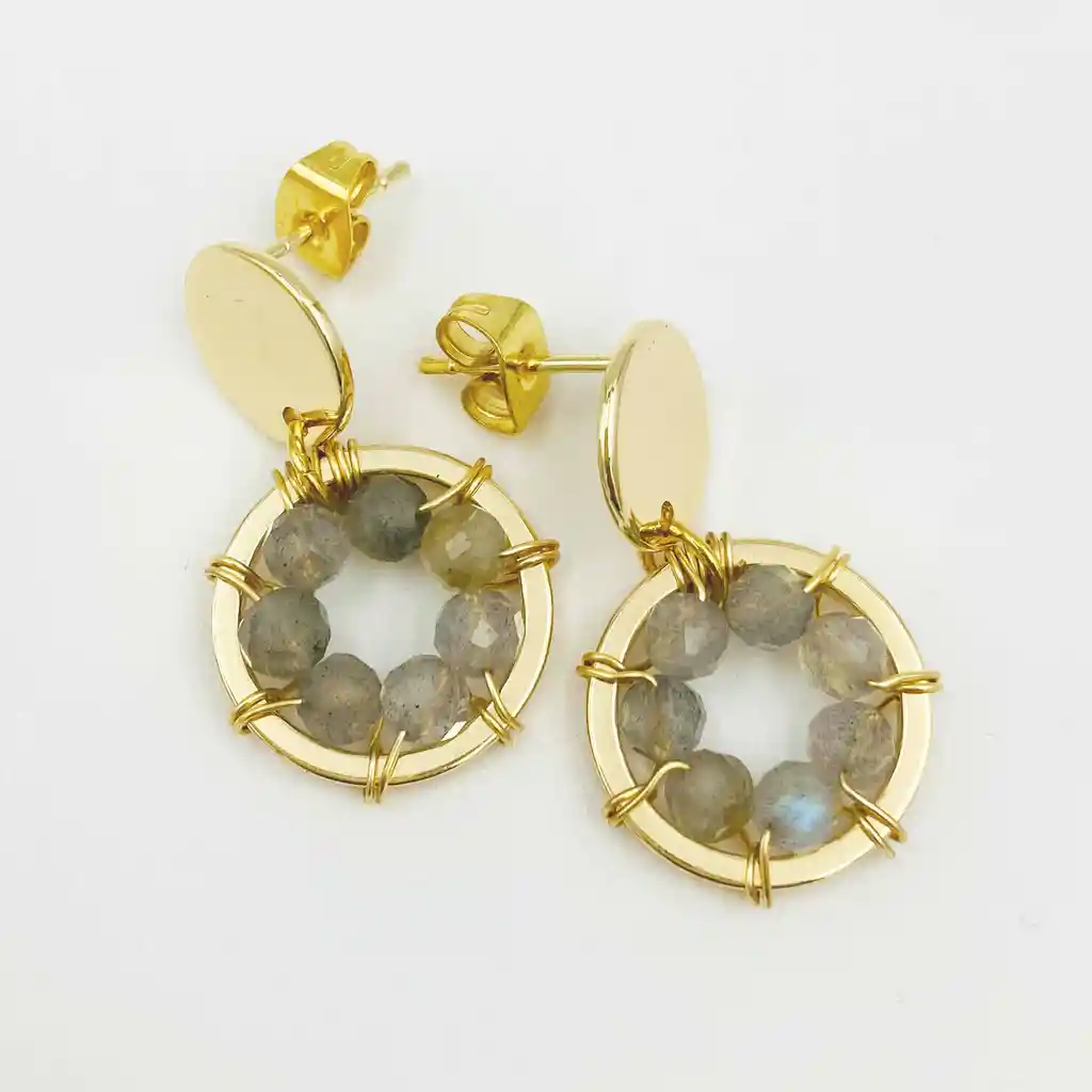 Aros Caroco, con un disco en la parte superior y una argolla de 1,5cm entorchada a mano con piedras Labradorita naturales, bronce con baño de oro de 18k libre de níquel, los aros miden 2,6cm de largo total.