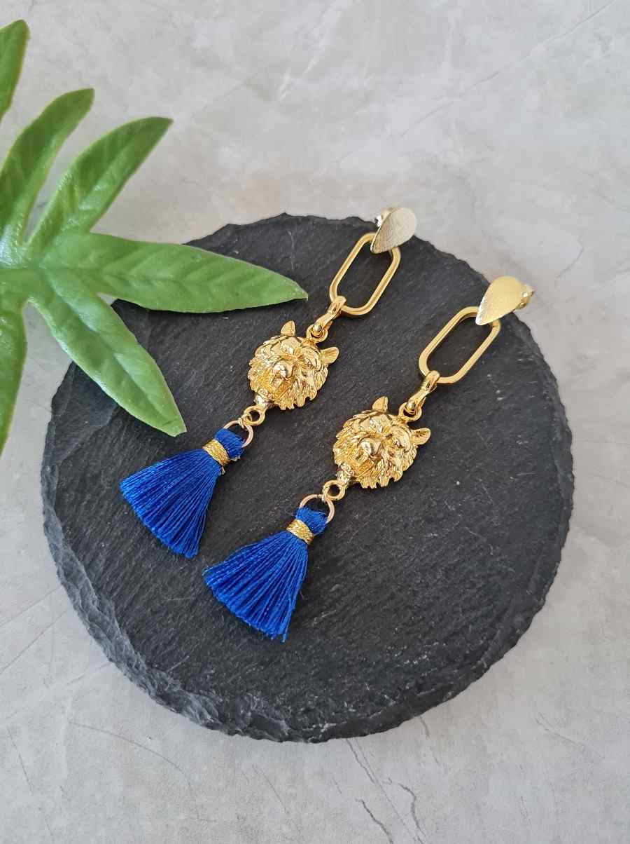 <p>Buscas un look ondero y no pasar desapercibida? Empodérate con la sabiduría y la valentía de las lobas. Aros enchapados en oro 18k . Libres de Níquel . Borla Azul. Miden 8, 2 cm. Se entregan envueltos en un papel seda dentro de una preciosa cajita. Perfecta para regalar y quedar como reina.</p>