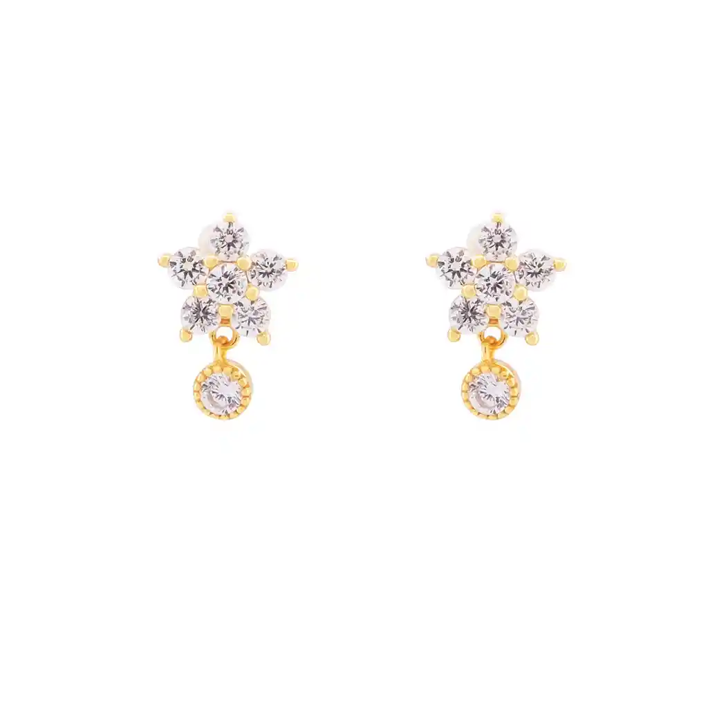 Par de aros en forma de flor con circones y pequeño circón colgante, elaborado en plata 925, libre de níquel y enchapados en oro 22k. Medidas: Largo: 12mm Ancho: 8mm Tipo de broche: silicón