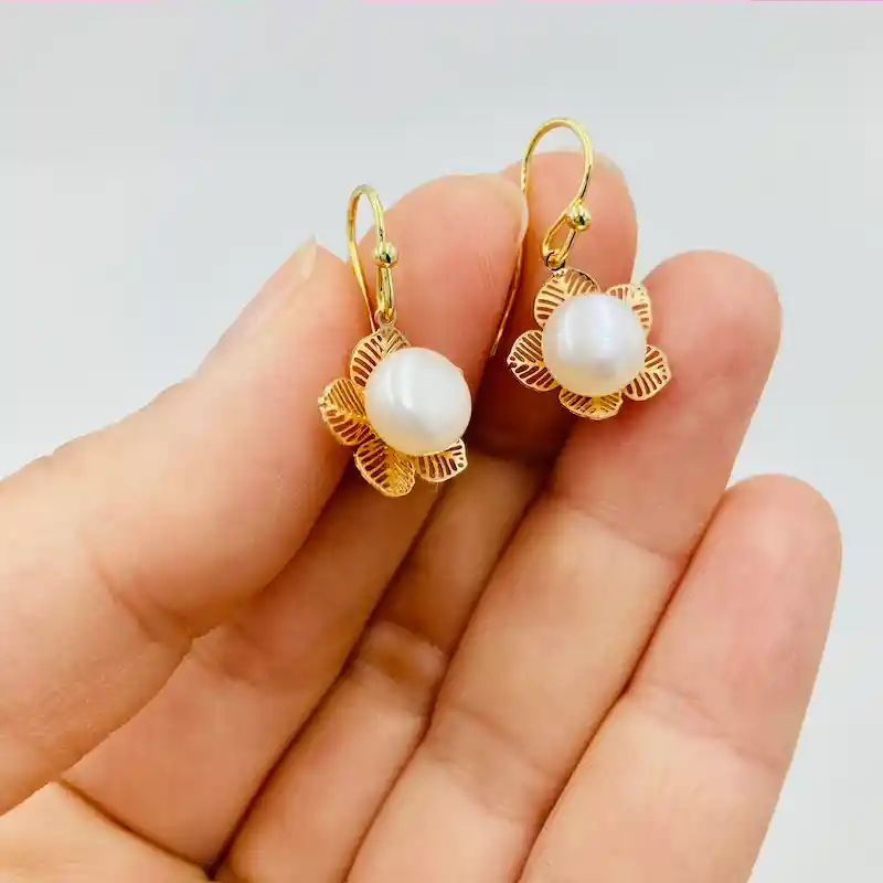Aros Caroco, gancho y flor tipo filigrana dorados con una perla de 8mm. al centro. Baño de oro de 18k. Largo total de los aros: 2,3cm.