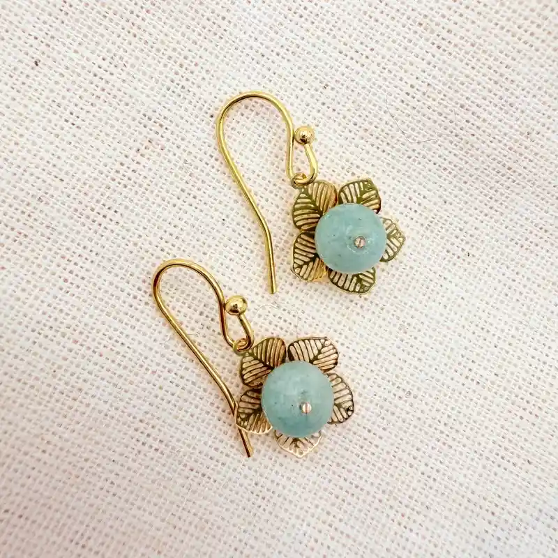 Aros de la marca Caroco, con un gancho y una flor dorados, una piedra Amazonita natural al centro. Largo total de los aros: 2cm. Material: bronce bañado en oro de 18k. Recomendaciones de cuidado: Mantén tus joyas separadas unas de otras para evitar que se enreden y se rayen. Evita el uso de forma de directa de químicos como perfumes, cremas y productos de limpieza. Guarda tus accesorios limpios en un lugar seco y lejos del sol y la humedad.