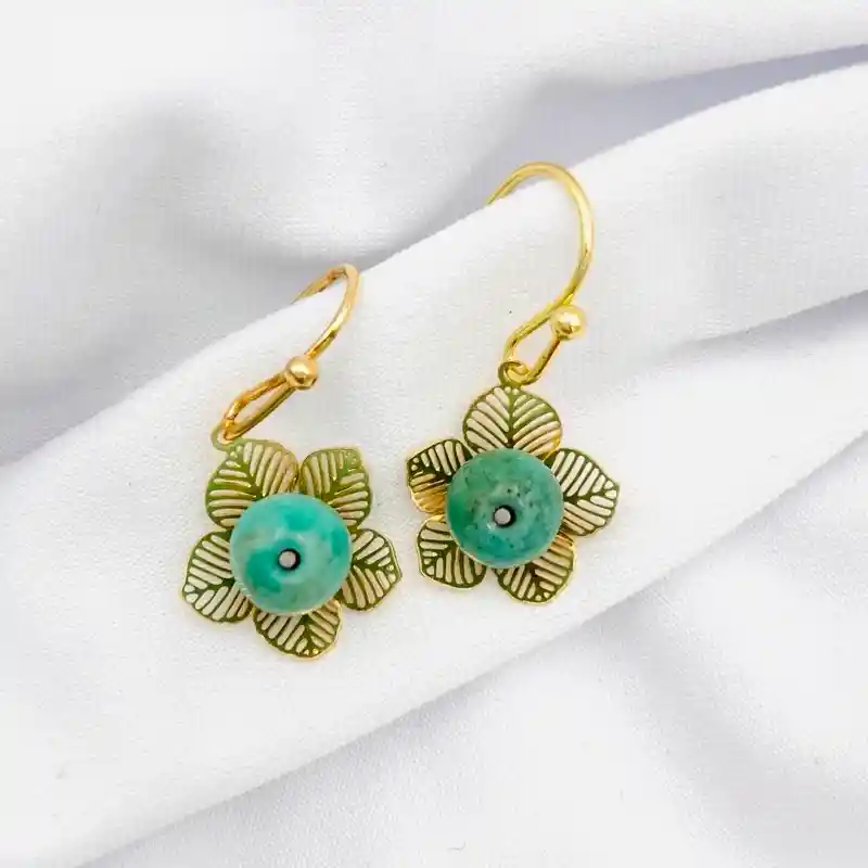 Aros Caroco dorados pequeños, gancho y flor filigrana con piedra Turquesa Africana. Largo total: 2,5cm.
