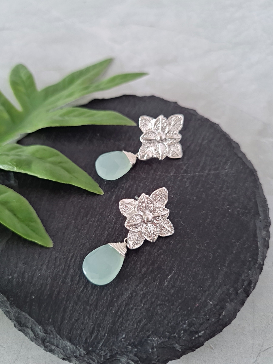 Sin duda estos aros iluminarán tu look! Son frescos y de un color suave para que puedas combinarlo como quieras! De la flor bañada en plata cae una piedra natural Calcedonia celeste, que es la piedra que simboliza la generosidad y el instinto maternal.
