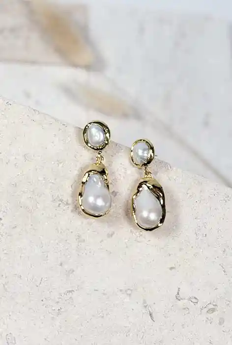 Estos elegantes aros cuentan con perlas de río únicas, destacadas por su forma natural e irregular. Cada perla está engastada dentro de un borde dorado que tiene un diseño sutilmente texturizado, añadiendo un toque de brillo. Esta combinación de perla y oro ofrece un estilo que es a la vez clásico y moderno.
