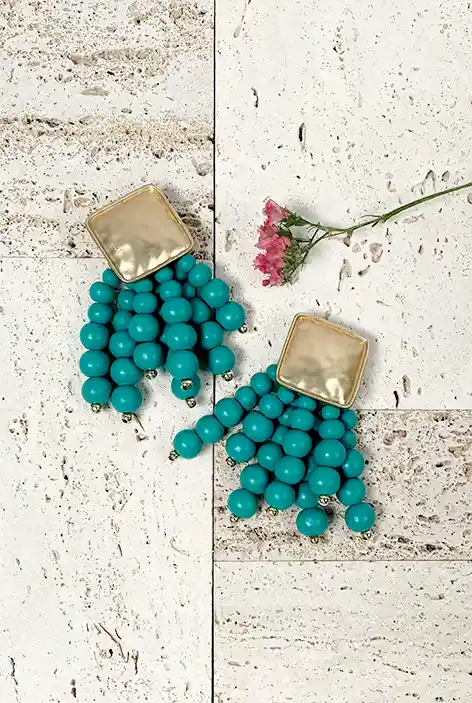 Estos aros se caracterizan por una base cuadrada de metal dorado con textura martillada que refleja la luz de manera encantadora. De ella cuelgan hileras de mostacillas de madera en un tono vibrante de un tono turquesa oscuro, dispuestas en distintos largos para crear un efecto cascada aportando movimiento y un toque fresco. Estos aros mezclan el encanto rústico de la madera con el brillo sofisticado del metal, ofreciendo un accesorio único y llamativo.