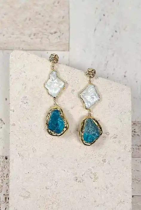 Aros de metal dorado con piedra natural cianita azul, conocida por su intensa tonalidad y textura natural, que contrasta de manera perfecta con la perla de río y su brillo sutil. El vástago en forma de nudo no solo añade un toque de sofisticación, sino que también aporta una estructura única y un detalle único a cada pieza. Estos aros tienen un peso considerable, lo que refleja la calidad y durabilidad de los materiales utilizados.