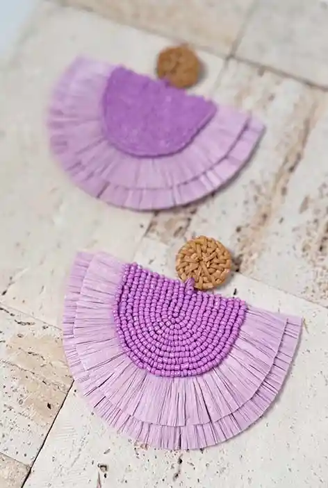 Estos aros abanico XL están elaborados con rafia color lila, aportando un toque suave y elegante. Las mostacillas son de un color lila oscuro tejidas a mano, creando un diseño atractivo que capta la atención. El vástago, hecho de rafia tejida en color café, complementa perfectamente el conjunto, manteniendo el estilo natural y delicado del diseño. A pesar de su tamaño, estos aros son increíblemente ligeros, lo que los hace cómodos para llevar durante horas.
