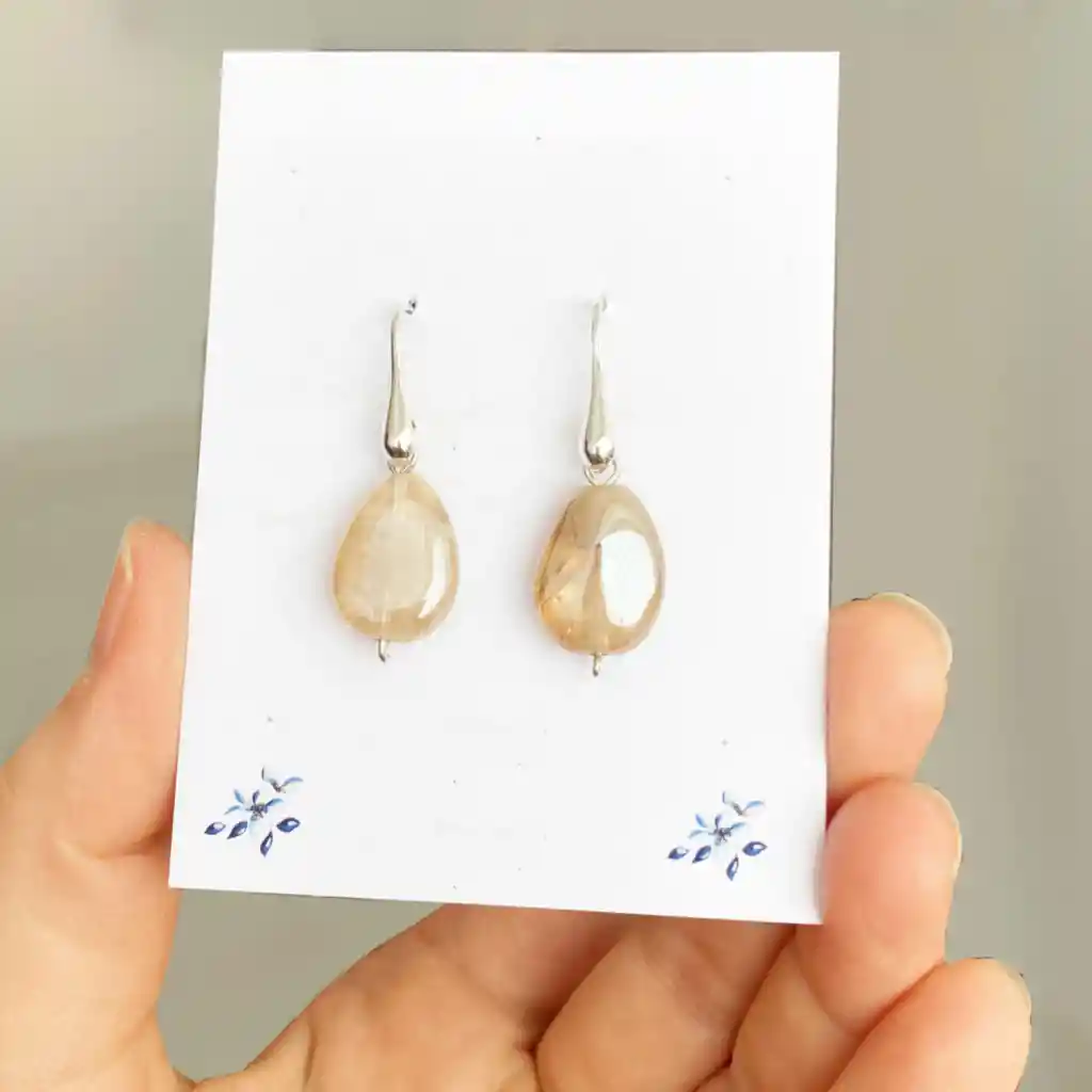 Aros Caroco, con gancho de plata y una piedra Agata tornasol. La piedra es sumergida en un baño electrolítico para darle este toque tornasolado. Largo total de los aros 3,2cm