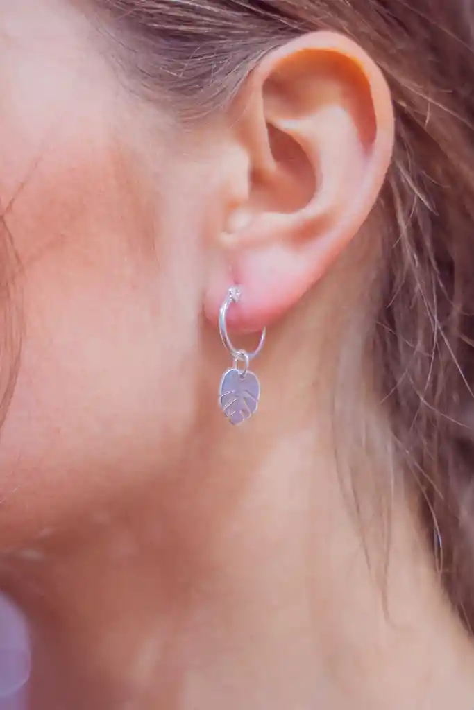 AROS CON COLGANTE DE HOJA TROPICAL PLATEADA.