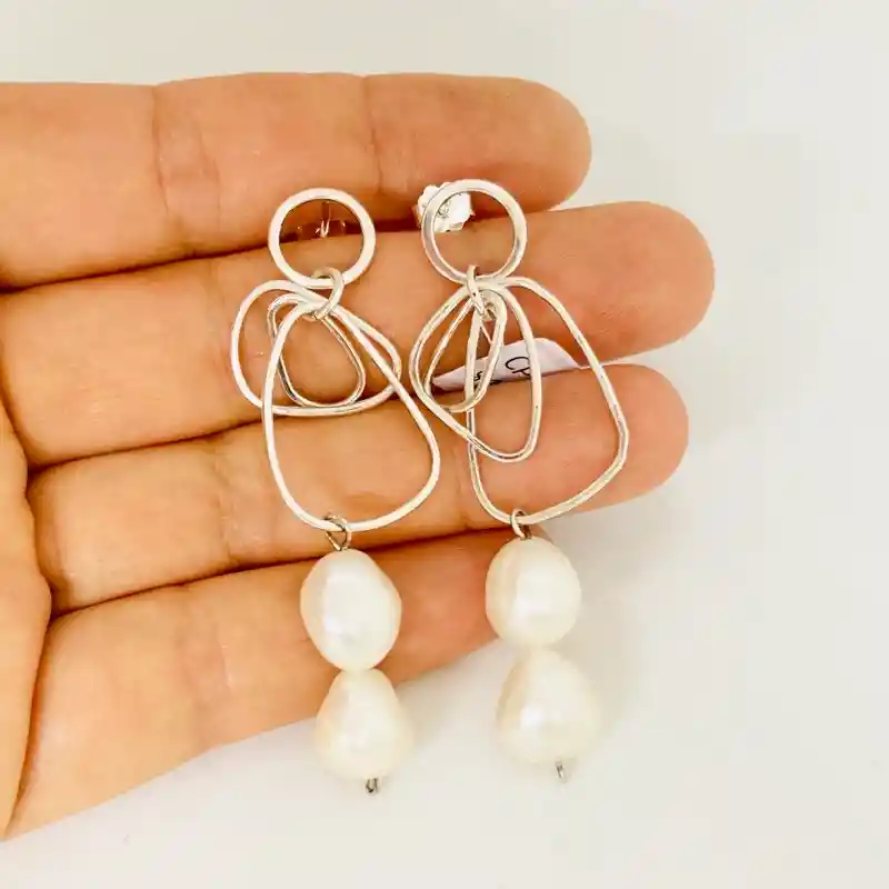 Aros largos de plata. Con argollas y figuras irregulares y 2 perlas grandes al final.