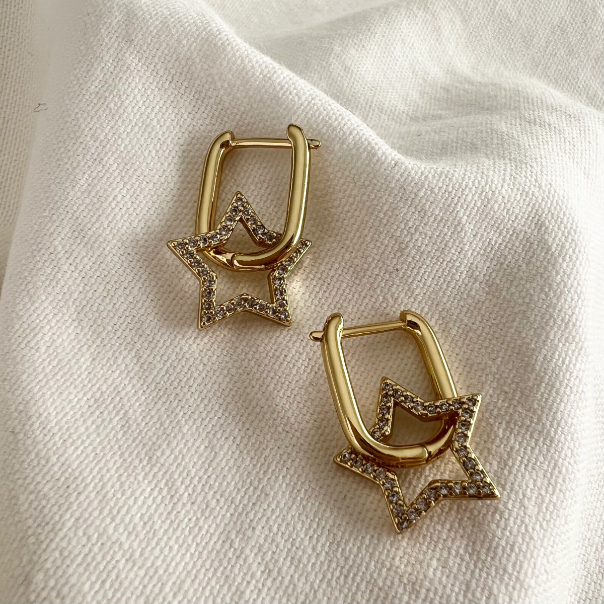 Estas argollas rectangulares no pueden más de taquillas y estilosas. La estrella la puedes sacar si quieres para dejar la argollita sola, aunque a nosotras nos encanta con la estrella puesta. De cualquier forma, este par de aros es cómo un dos en uno; argolla rectangular sola para algo mas formal y con la estrellita con circones para una ocasión mas relajada. Las tenemos en dos opciones; enchapadas en oro 18 kilates o plata libre de níquel e hipoalergénic
