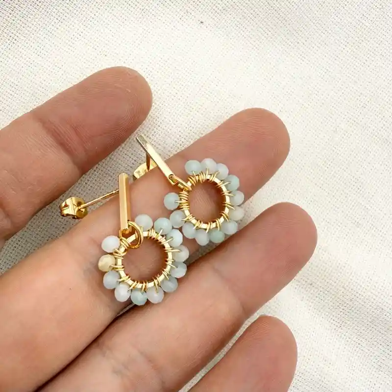 Aros Caroco: ¨Margarita verde¨. Palito y argolla dorados, arcolla entorchada a mano con piedras Amazonita naturales. Largo total de los aros: 2,5cm. Bronce bañado en oro de 18k. Recomendaciones de cuidado: Mantén tus joyas separadas unas de otras para evitar que se enreden y se rayen. Evita el uso de forma de directa de químicos como perfumes, cremas y productos de limpieza. Guarda tus accesorios limpios en un lugar seco y lejos del sol y la humedad.
