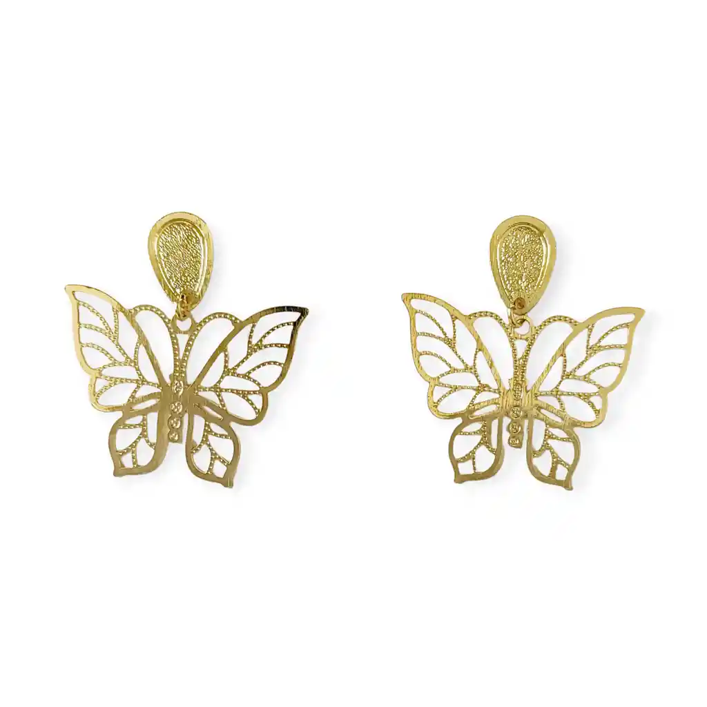 Aros mariposa enchapado en oro de 18K. Fabricados en bronce y enchapados en oro de 18K. El material es hipoalergénico, su calidad es garantizada y libre de níquel. Medidas: Largo total de los aros 32mm. Tamaño mariposa 29mm ancho y 23mm largo. Tiene un peso de 2,4 gr.