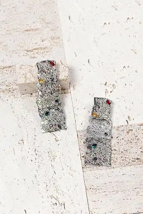 Estos aros plateados tienen un diseño muy original con tres capas que varían en tamaño y están llenas de textura. Están decorados con cristales de colores que les dan un toque divertido y brillante. La combinación de la superficie rugosa del metal con el brillo de los cristales hace que estos aros sean tanto llamativos como chic.
