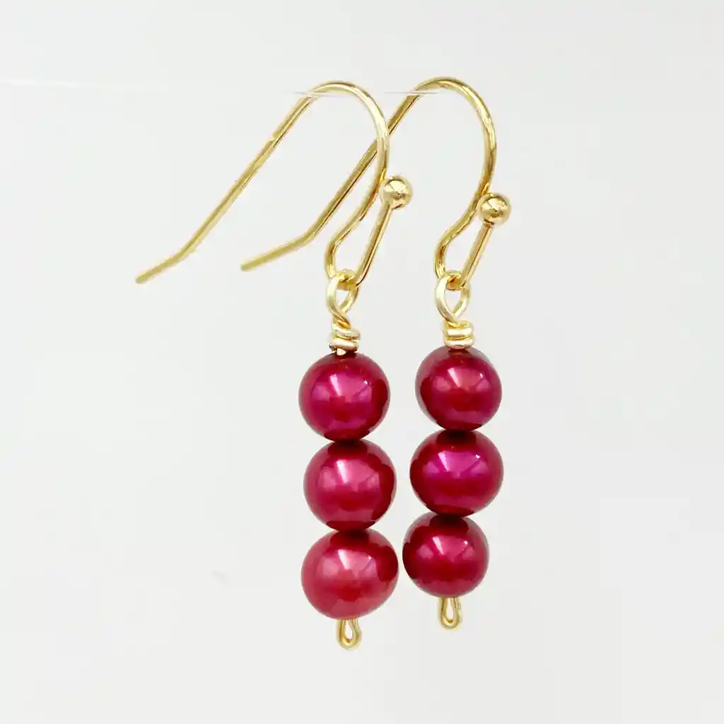 Aros Caroco dorados con gancho y 3 perlas naturales burdeo/cereza- baño de oro