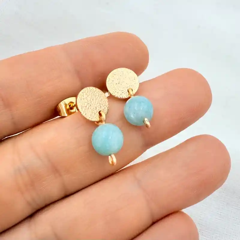 Aros de la marca Caroco, con piedra Amazonita natural de 6mm. colgando de un disco muy pequeño dorado y con textura. Los aros miden 1,8cm. de largo total. Material: bronce bañado en oro de 18k. Recomendaciones de cuidado: Mantén tus joyas separadas unas de otras para evitar que se enreden y se rayen. Evita el uso de forma de directa de químicos como perfumes, cremas y productos de limpieza. Guarda tus accesorios limpios en un lugar seco y lejos del sol y la humedad.