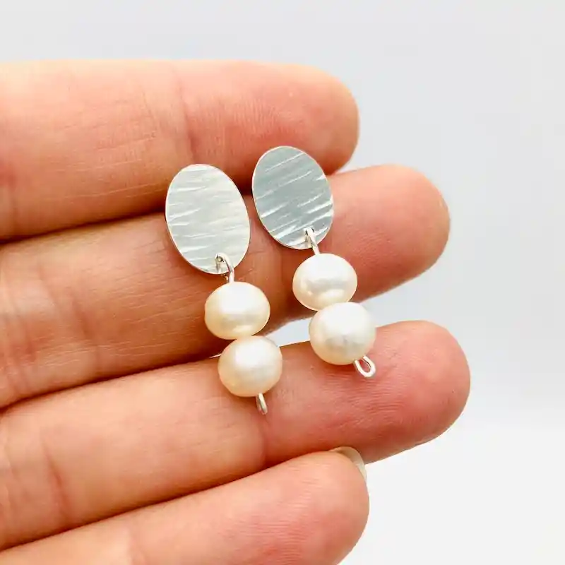 Aros Caroco, Óvalo de plata martillado con rayitas, y 2 perlas naturales 6mm (perlas cultivadas de agua dulce)