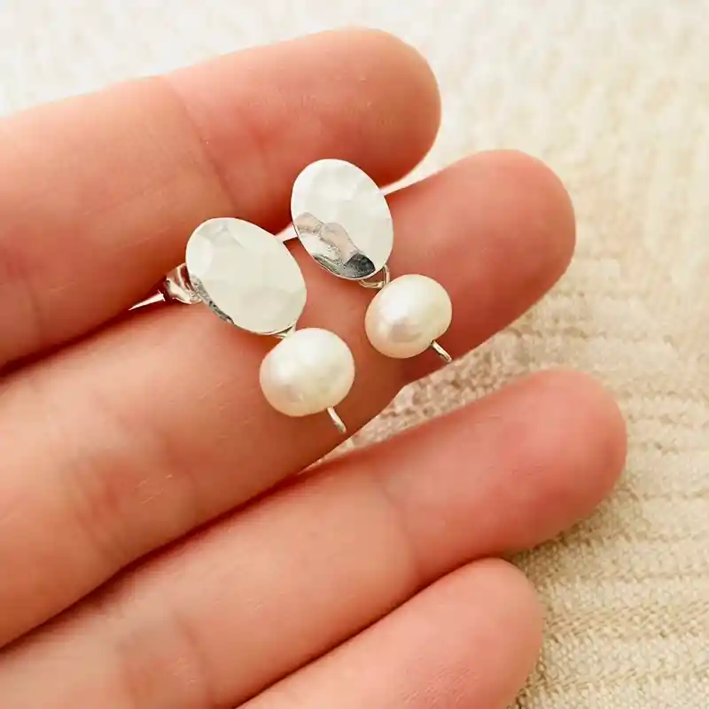 Aros de la marca Caroco, un óvalo martillado de plata y una perla natural de 6mm. Los aros miden 1,8cm. de largo total.