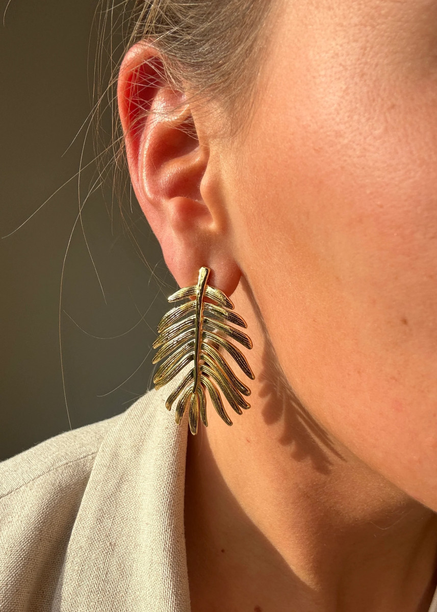 Uno de los favoritos!!!!Los aros Palm son imponentes y brillan por si solos. Los tenemos en dos opciones; de 5 cm de largo y en 3.5 cm de largo.Son de bronce enchapados en oro 18 kilates, o plata libre de níquel. Hipoalergénico