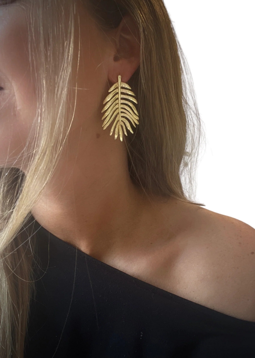 Uno de los favoritos!!!!Los aros Palm son imponentes y brillan por si solos. Los tenemos en dos opciones; de 5 cm de largo y en 3.5 cm de largo.Son de bronce enchapados en oro 18 kilates, o plata libre de níquel. Hipoalergénico