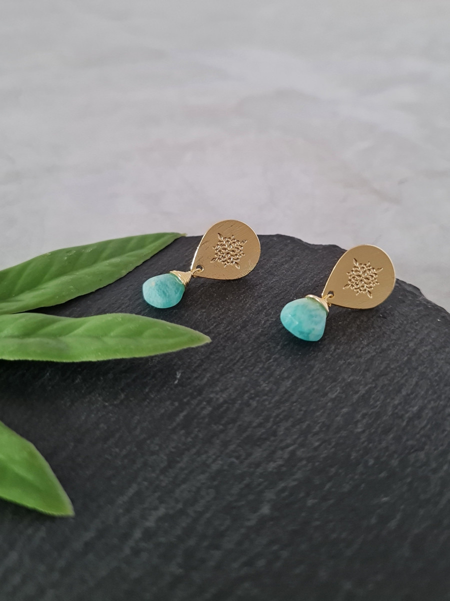 Aros Básicos, Infaltables, Inprescindibles en tu colección de Aros! Ideales para el día a día y perfectos para regalar! Imposible que alguien no le gusten! Estos Aros son bañados en oro con Piedra Natural Amazonita. Miden 2,4 cm