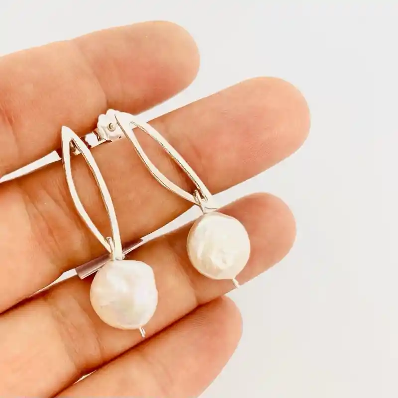 Aros pin pétalo de Crisantemo grande y delgado, de plata, con una perla plana de 1cm.