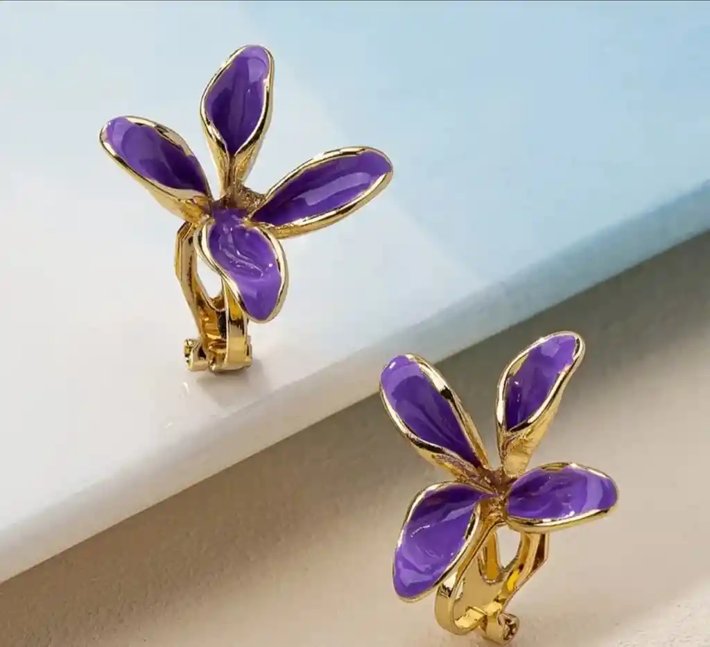 Hermosos aros de fantasía ,con clip, color morados con borde dorado. Medidas: 1cm, Aprox.