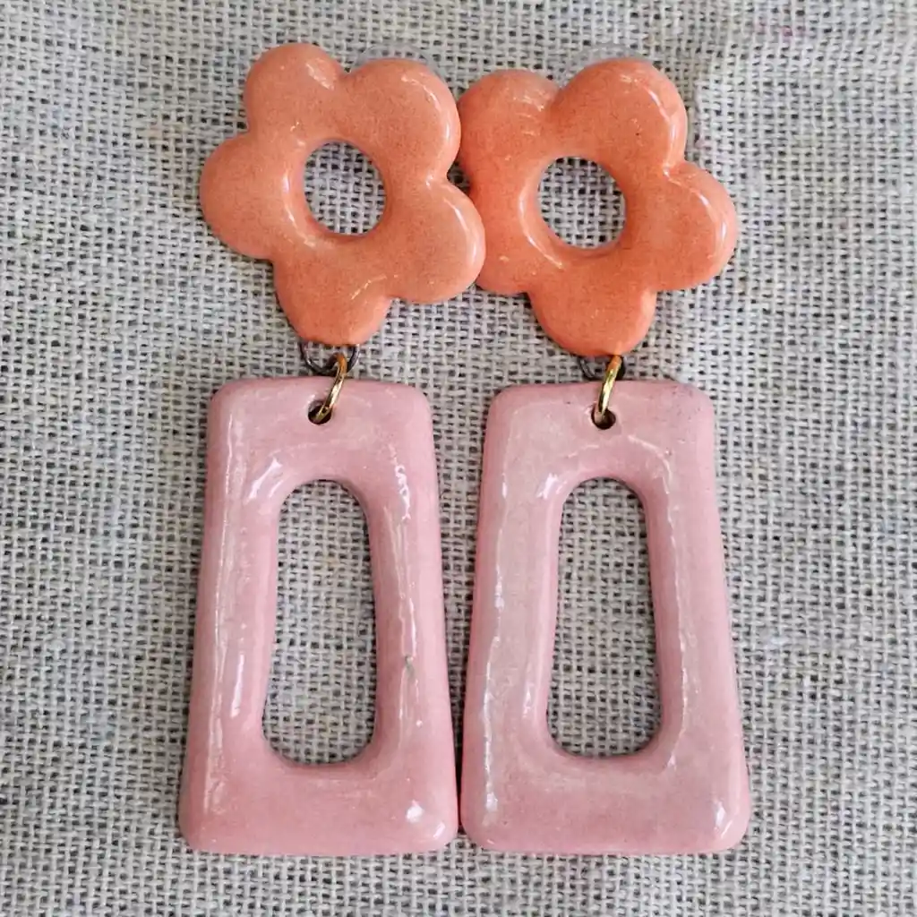 Piezas de joyería cerámica hechas a mano por Connie Achurra, ganchos y cadenas de bronce con baño de oro, palitos de acero quirúrgico e hipoalergénico. Los aros son muy livianos, 8 gr aprox y las piezas son firmes y duraderas.