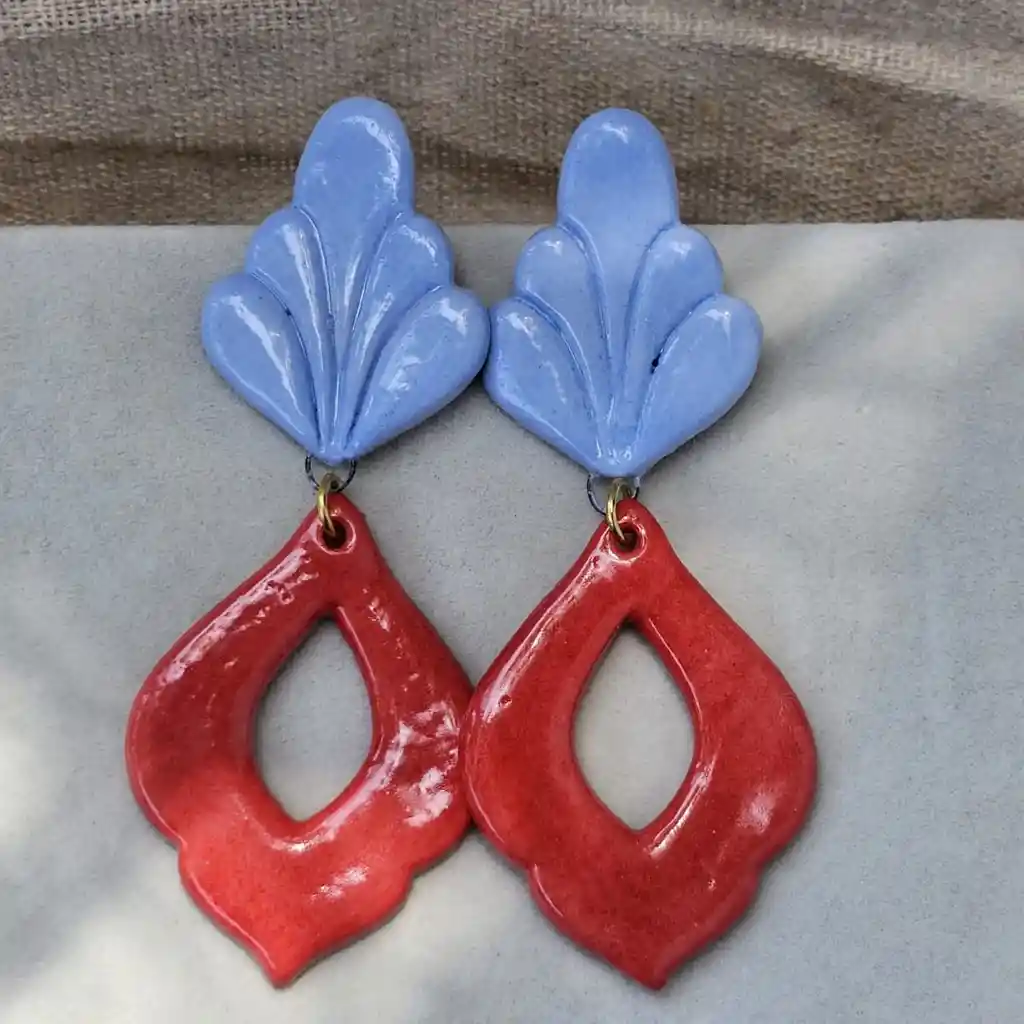 Piezas de joyería cerámica hechas a mano por Connie Achurra, ganchos y cadenas de bronce con baño de oro, palitos de acero quirúrgico e hipoalergénico. Los aros son muy livianos, 8 gr aprox y las piezas son firmes y duraderas.