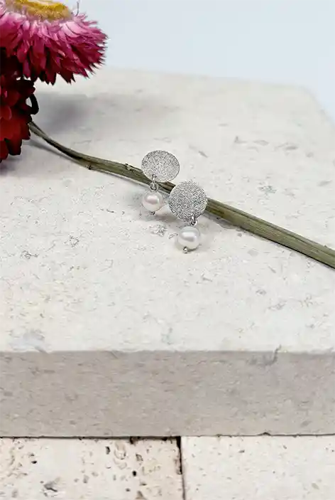 Estos aros combinan la elegancia clásica de las perlas blancas con un vástago de plata texturizada, creando un diseño que es a la vez delicado y moderno. El brillo suave de las perlas resalta junto a la textura rústica de la plata, aportando una combinación perfecta de sofisticación y frescura. Este par es ideal para quienes buscan un accesorio versátil que funcione tanto para el día a día como para ocasiones especiales, con un toque artesanal y único.