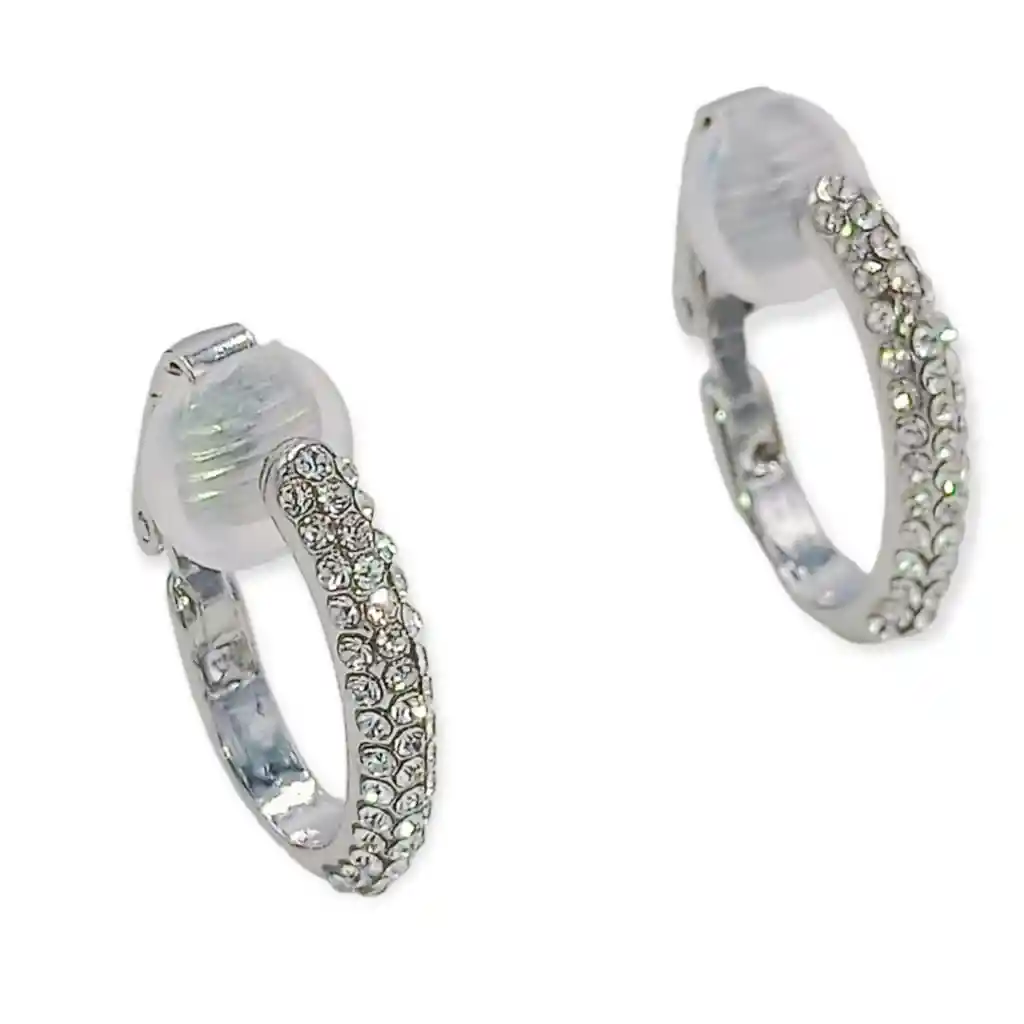 Si buscas un arete o pendiente para unas orejitas rasgadas, recién operadas o simplemente no deseas realizar ninguna perforación, tenemos la solución para ti. Estos bonitos pendientes ofrecen un diseño clásico, con cierre de clip, son super ligeros, no pesan nada, asi que los puedes llevar con total tranquilidad. Características: Material: Metal bañado en plata Diámetro: 13 mm Piedra: Zirconios Peso aprox 1 g