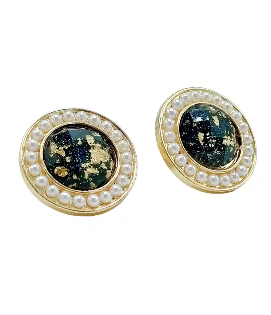 Si buscas un arete o pendiente para unas orejitas rasgadas, recién operadas ó simplemente no deseas realizar ninguna perforación, tenemos la solución para ti. Estos bonitos pendientes ofrecen un diseño clásico y creativo, pues se cierra super sencillo con un clip. Esta decorado en todo su borde con lindas perlas sintéticas y en el centro lo decora una resina oscura brillante cumplen perfectamente con lo estas buscando Características: Material: Metal bañado en oro Diámetro: 23 mm Piedra: Perlas Peso aprox 1 g