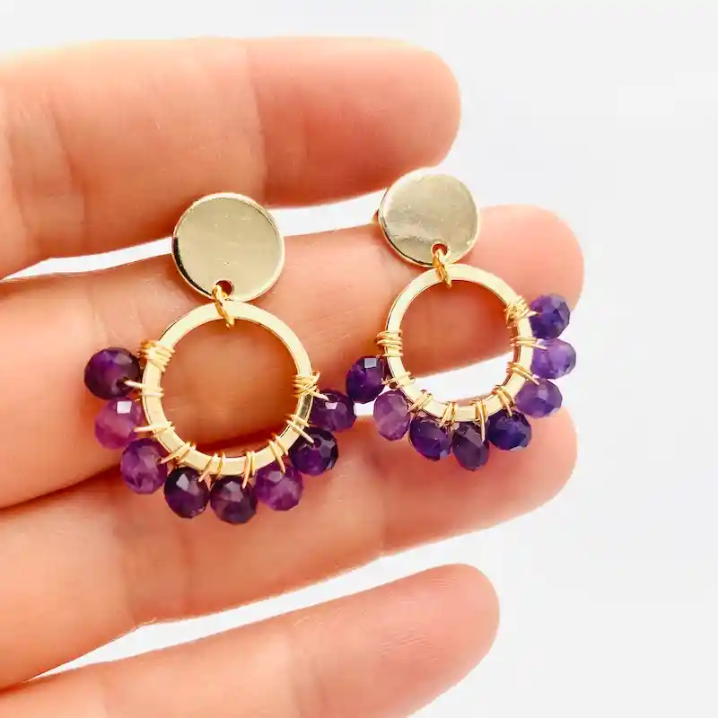 Aros Caroco, "Tulipan" Amatista entorchada, rondela 4x3, disco liso y argolla 1.5 bañado en oro, largo total 3cm.