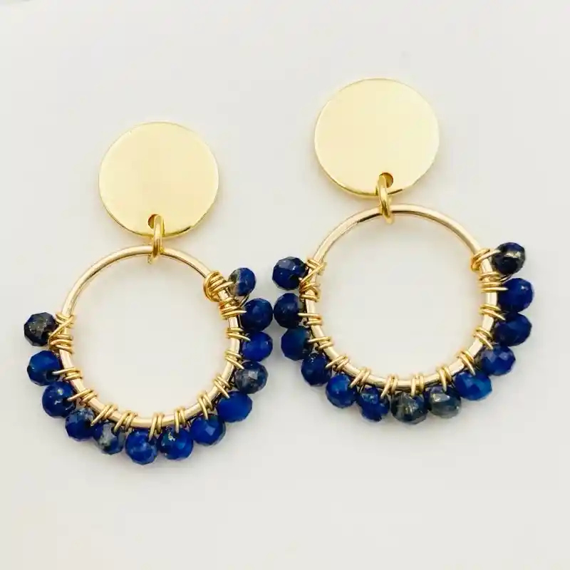 Aros Caroco entorchados, "Tulipán Azul" con piedra Lapislazuli, argolla 15x1 con disco liso dorado. 2,8cm.