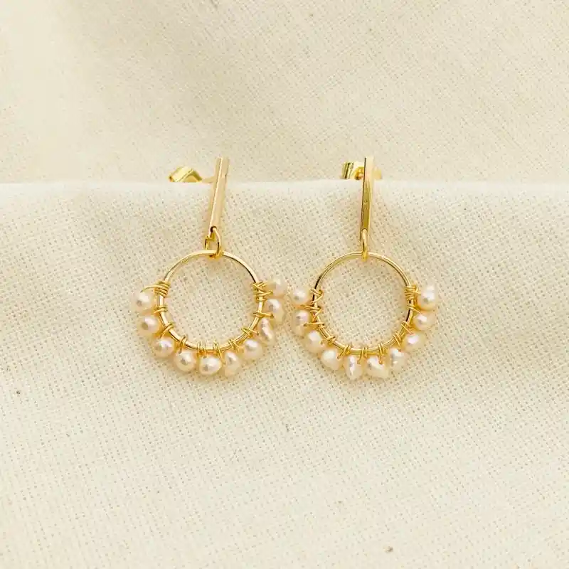 Aros Caroco "Tulipán BLANCO¨con un palito y una argolla de 1,5cm entorchada a mano con perlas mini naturales. Los aros miden 3cm. de largo total. Material: bronce bañado en oro de 18k. Recomendaciones de cuidado: Mantén tus joyas separadas unas de otras para evitar que se enreden y se rayen. Evita el uso de forma de directa de químicos como perfumes, cremas y productos de limpieza. Guarda tus accesorios limpios en un lugar seco y lejos del sol y la humedad.