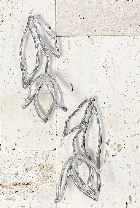Estos aros, inspirados en la forma de tulipán, combinan un diseño naturalista con un toque moderno. Fabricados en metal plateado y con una textura martillada que refleja la luz, presentan un acabado brillante y una apariencia visualmente rica. Su diseño evoca las curvas suaves de un tulipán, resultando en un contorno armonioso que es cómodo y fácil de llevar gracias a su peso ligero.