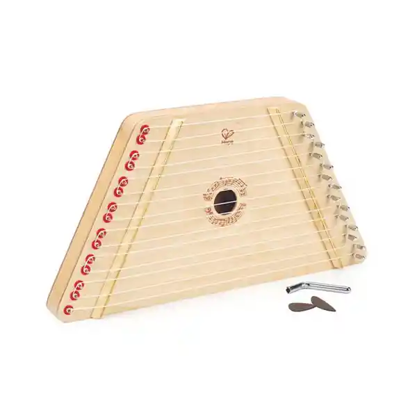Arpa de madera con dos uñetas y una herramienta para afinarla. Estimula el desarrollo rítmico y artístico de los niños. Dimensiones: 40 x 20.1 x 3.4 cm.