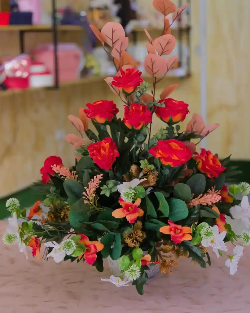 arreglo artificial de color naranja en base se arcilla moderna en forma de rambo