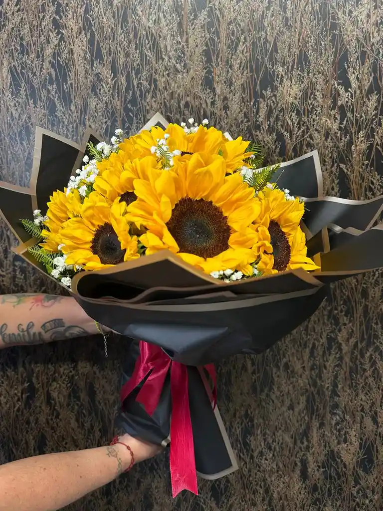 HERMOSO ARREGLO DE GIRASOL CON GYPSOPHILA Y PAPEL A ELECCION