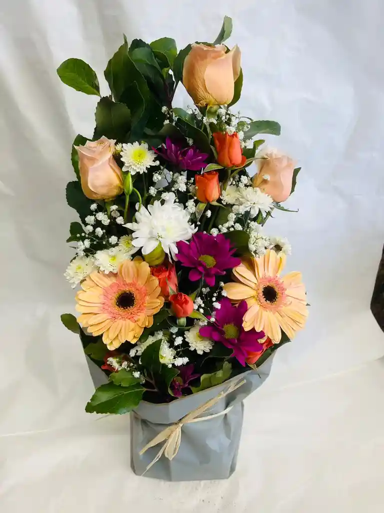 hermoso arreglo de 3 rosas color piel con 2 gerberas colo piel, gypso y papel koreano para toda ocasion