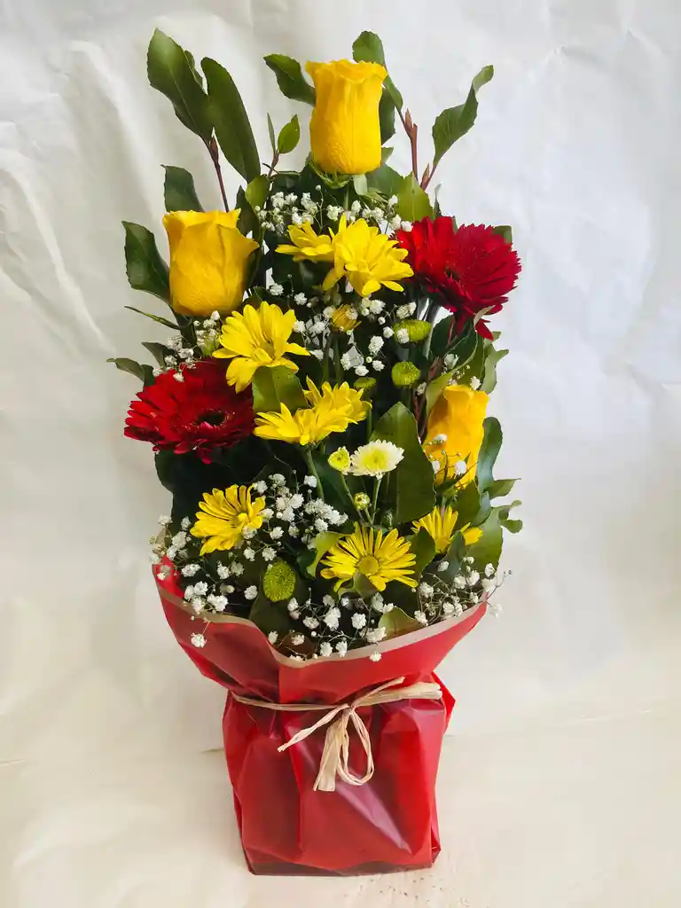 hermoso arreglo de 3 rosas amarillas con 2 gerberas rojas, mable amarillo, gypso y papel koreano para toda ocasion
