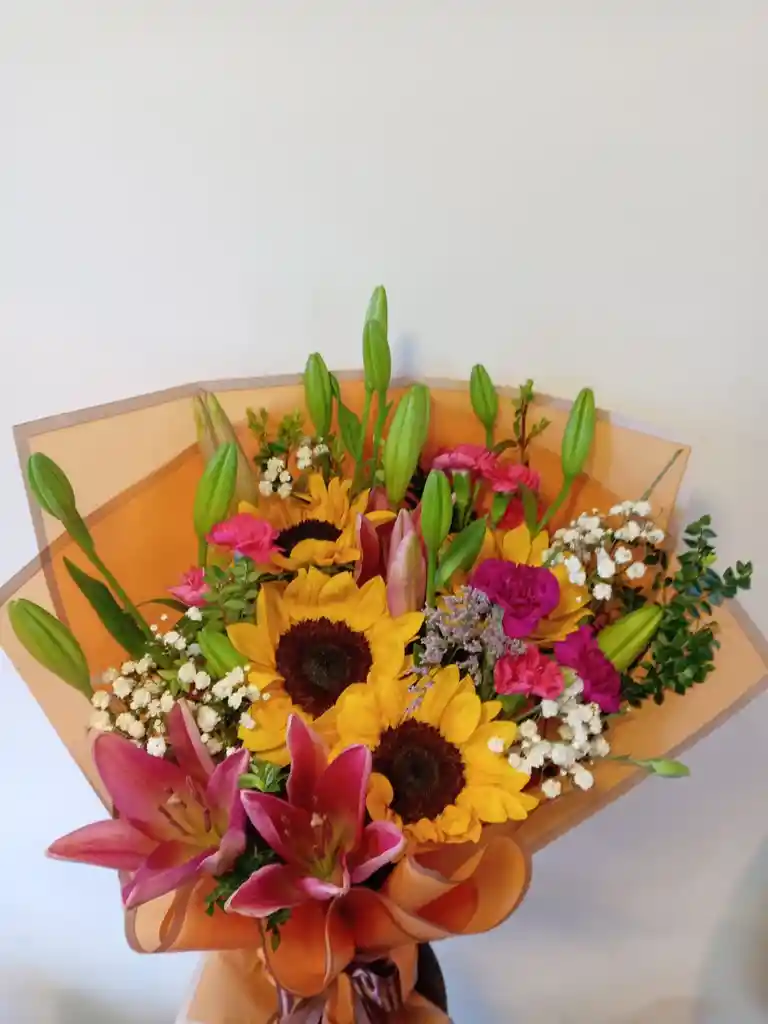 hermoso arreglo de 4 girasoles con lilium