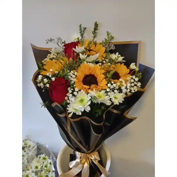 hermoso arreglo de 4 girasoles con 2 rosas y papel a eleccion