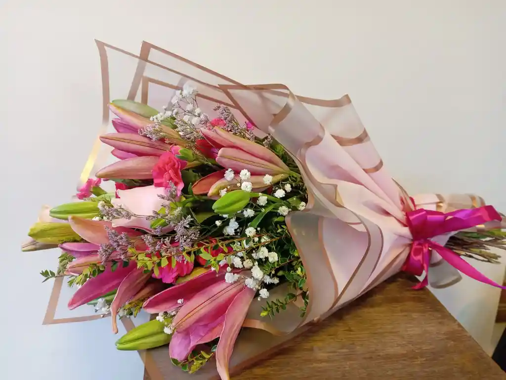 hermoso arreglo de 6 lilium con gypsophila y papel a eleccion